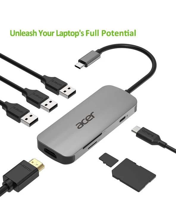 Acer HP.DSCAB.008. Interface de l’hôte: USB 3.2 Gen 2 (3.1 Gen 2) Type-C, Interfaces Hub: HDMI, USB 3.2 Gen 2 (3.1 Gen 2) Type-A, Cartes mémoire compatibles: SD. Taux de transfert de données: 5000 Mbit/s, Couleur du produit: Argent, Délivrance de la puissance USB jusqu’à: 100 W. Type d’alimentation d’énergie: USB. Prise en charge du système d’exploitation Windows: Windows 10, Prise en charge d’autres systèmes d’exploitation: Chrome. Largeur: 101 mm, Profondeur: 40 mm, Hauteur: 12,5 mm