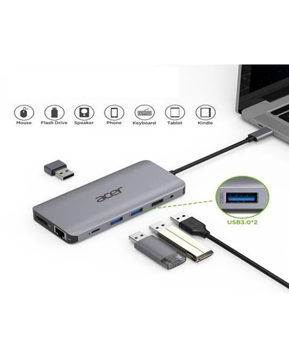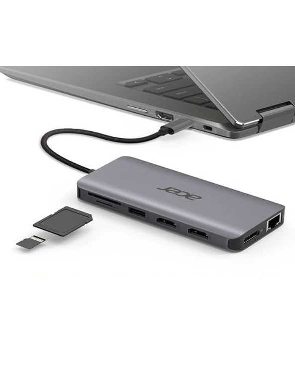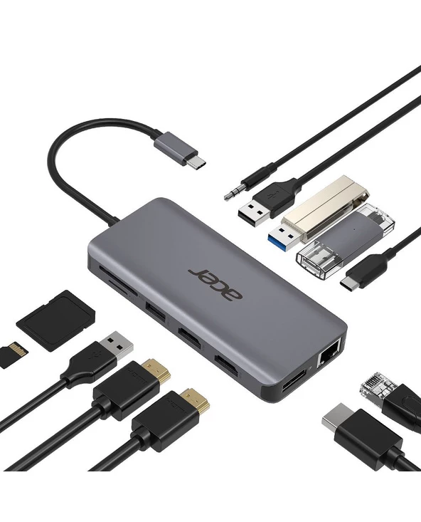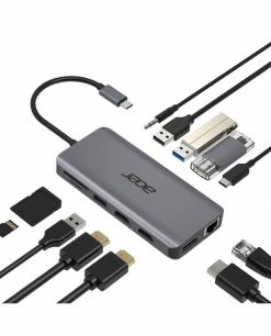 Acer HP.DSCAB.009. Technologie de connectivité: Avec fil, Interface de l’hôte: USB 3.2 Gen 1 (3.1 Gen 1) Type-C, Casque connection: 3,5 mm. LAN Ethernet : taux de transfert des données: 10,100,1000 Mbit/s. Couleur du produit: Argent, Cartes mémoire compatibles: SD. Prise en charge du système d’exploitation Windows: Windows 10. Largeur: 129 mm, Profondeur: 57 mm, Hauteur: 16 mm