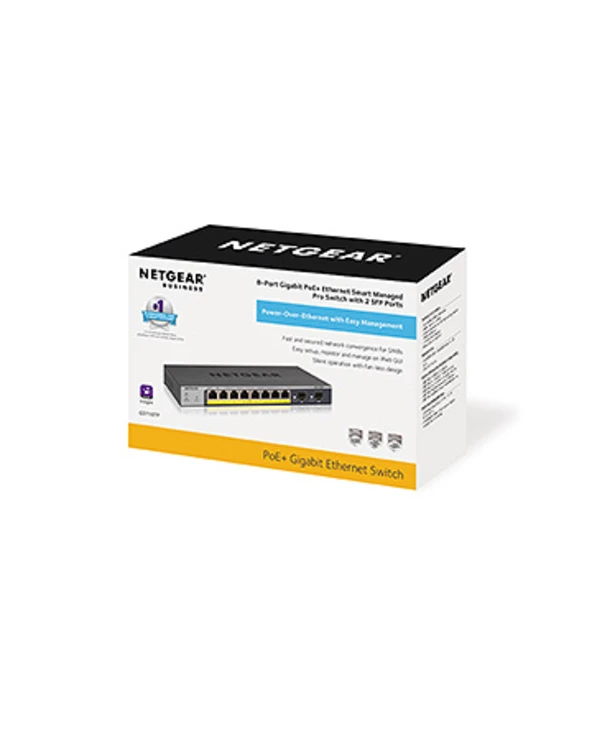 Netgear GS110TP. Type de commutateur: Géré, Banc de commutateurs: L2/L3/L4. Type de port Ethernet RJ-45 de commutation de base: Gigabit Ethernet (10/100/1000), Quantité de ports Ethernet RJ-45 de commutation de base: 8. Full duplex. Répertoire MAC: 8000 entrées, Capacité de commutation: 20 Gbit/s. Standards réseau: IEEE 802.3ab,IEEE 802.3af,IEEE 802.3i,IEEE 802.3u,IEEE 802.3x,IEEE 802.3z. Voltage d’entrée DC: 54 V. Connexion Ethernet, supportant l’alimentation via ce port (PoE)