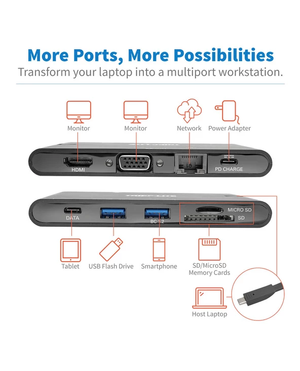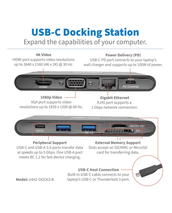 Tripp Lite U442-DOCK3-B. Technologie de connectivité: Avec fil, Interface de l’hôte: USB 3.2 Gen 2 (3.1 Gen 2) Type-C, Connecteur USB: USB Type-C. LAN Ethernet : taux de transfert des données: 1000 Mbit/s, Standards réseau: IEEE 802.3,IEEE 802.3az,IEEE 802.3u,IEEE 802.3x. Couleur du produit: Noir, Cartes mémoire compatibles: MicroSD (TransFlash), SD, Taux de transfert des données: 5 Gbit/s. Type de source d’alimentation: USB, Consommation électrique typique: 5 W. Certificats de durabilité: RoHS