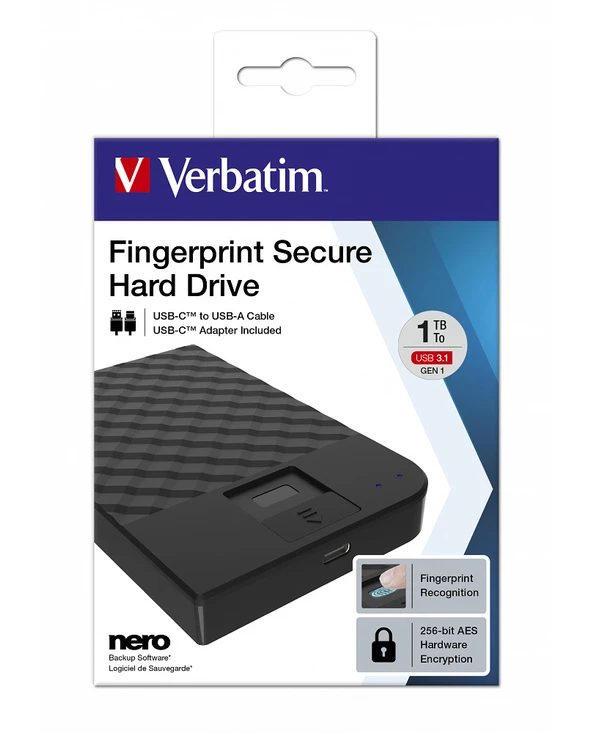 Verbatim Disque dur portable sécurisé à reconnaissance d’empreinte digitale 1 To. Capacité disque dur: 1000 Go. Version USB: 3.2 Gen 1 (3.1 Gen 1). Couleur du produit: Noir